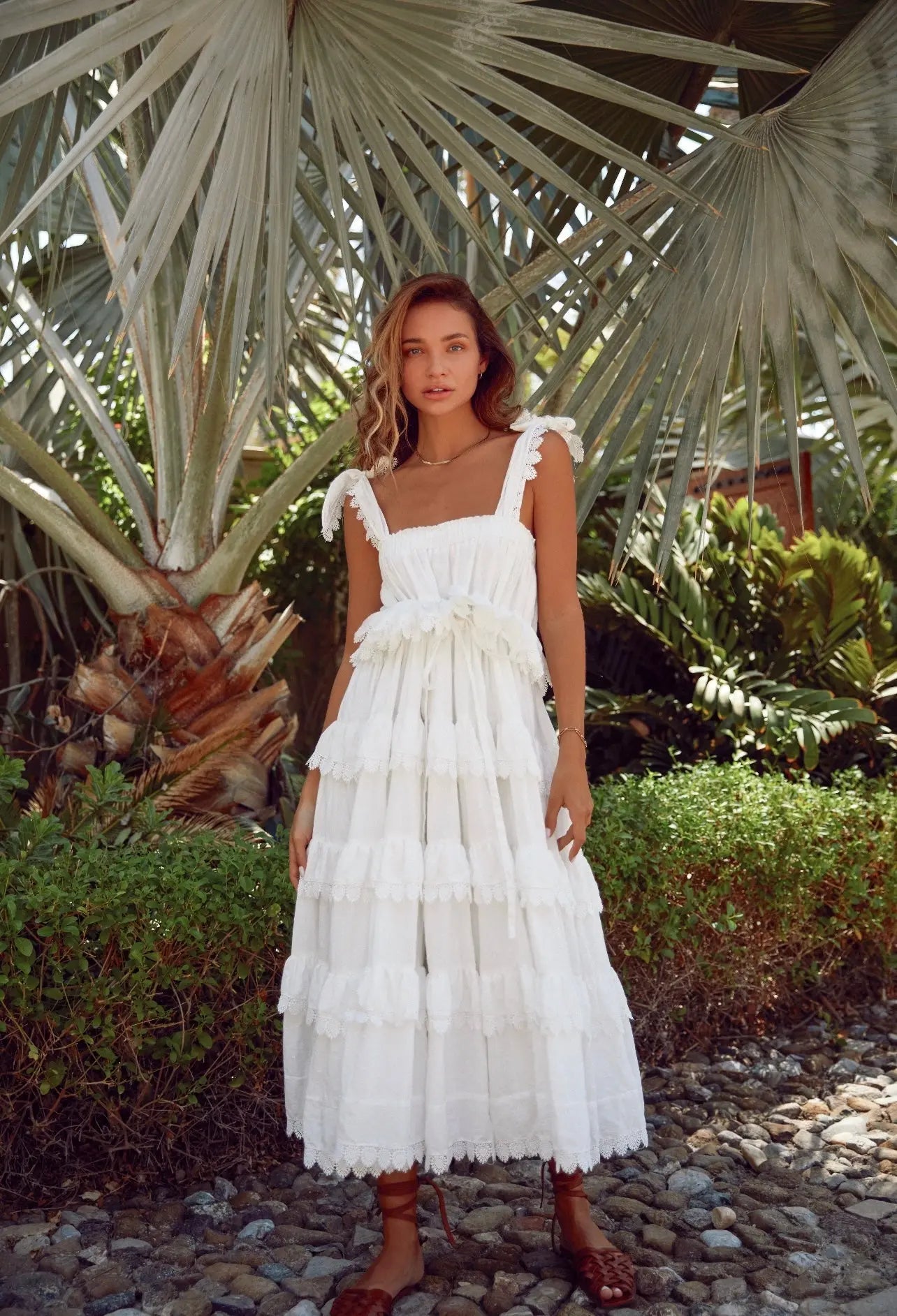 Our bestselling easy to wear layered frill dress in white with shoulder tie straps will look perfect against your sunkissed skin. This showstopper is made out of over 10m of fabric, gathered to perfection to give you the ultimate easy statement look. Bust area has an elastic with a button at the back.