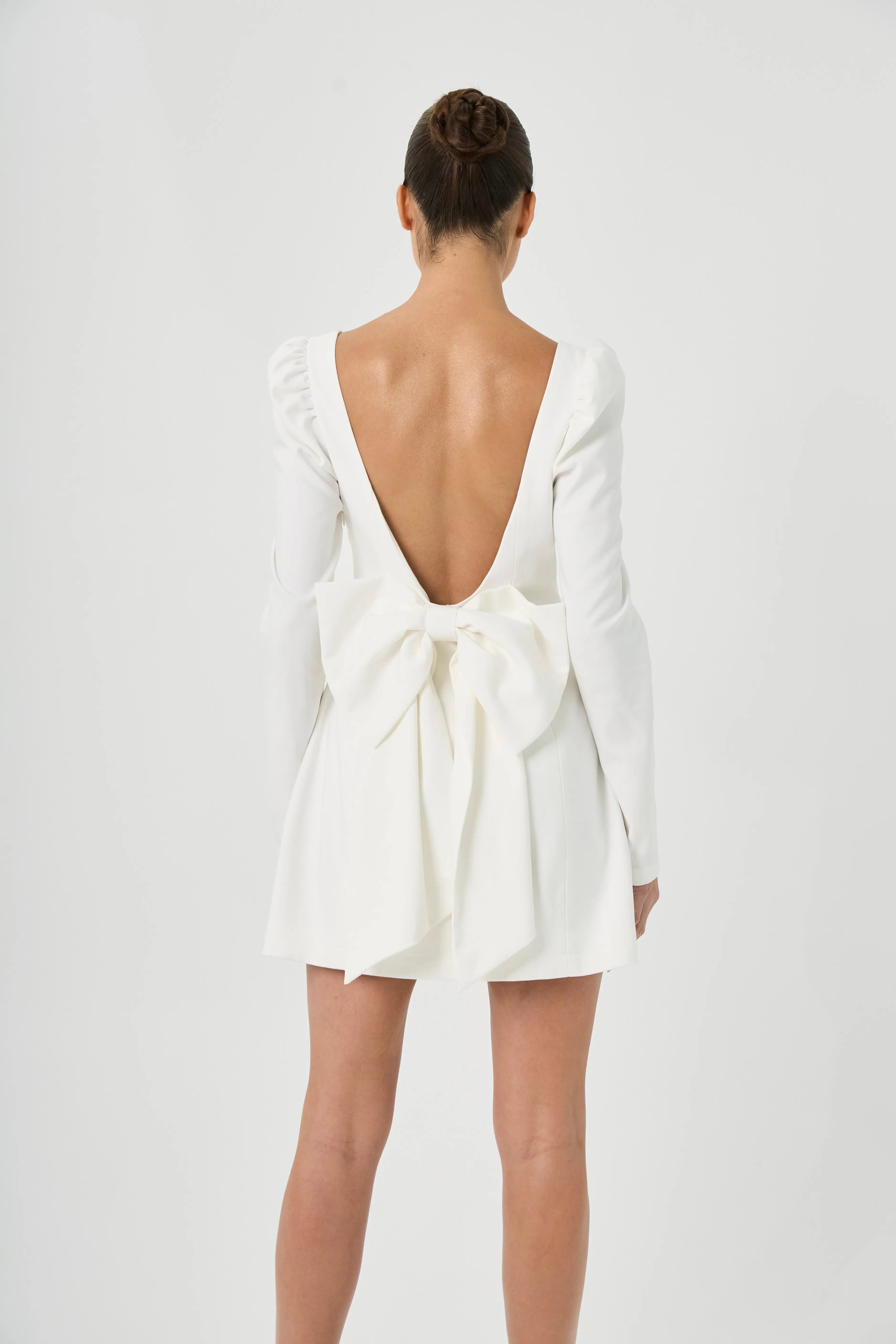 Indulge in luxury with our Black Bow Dress from the Rouge collection featuring a low back detail and long sleeves for a sophisticated touch. With its alluring mini length and statement bow, you'll make a statement and be the envy of all.