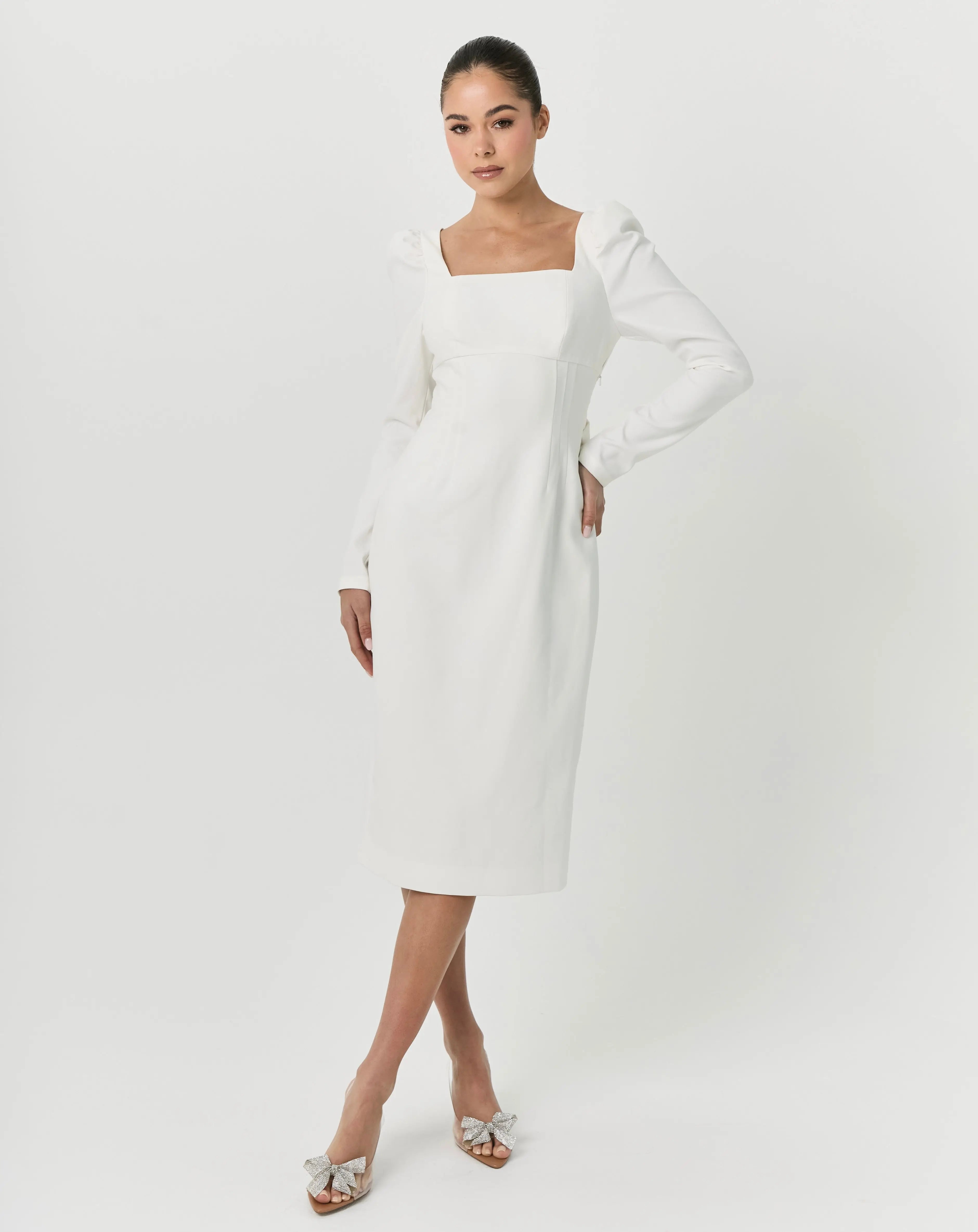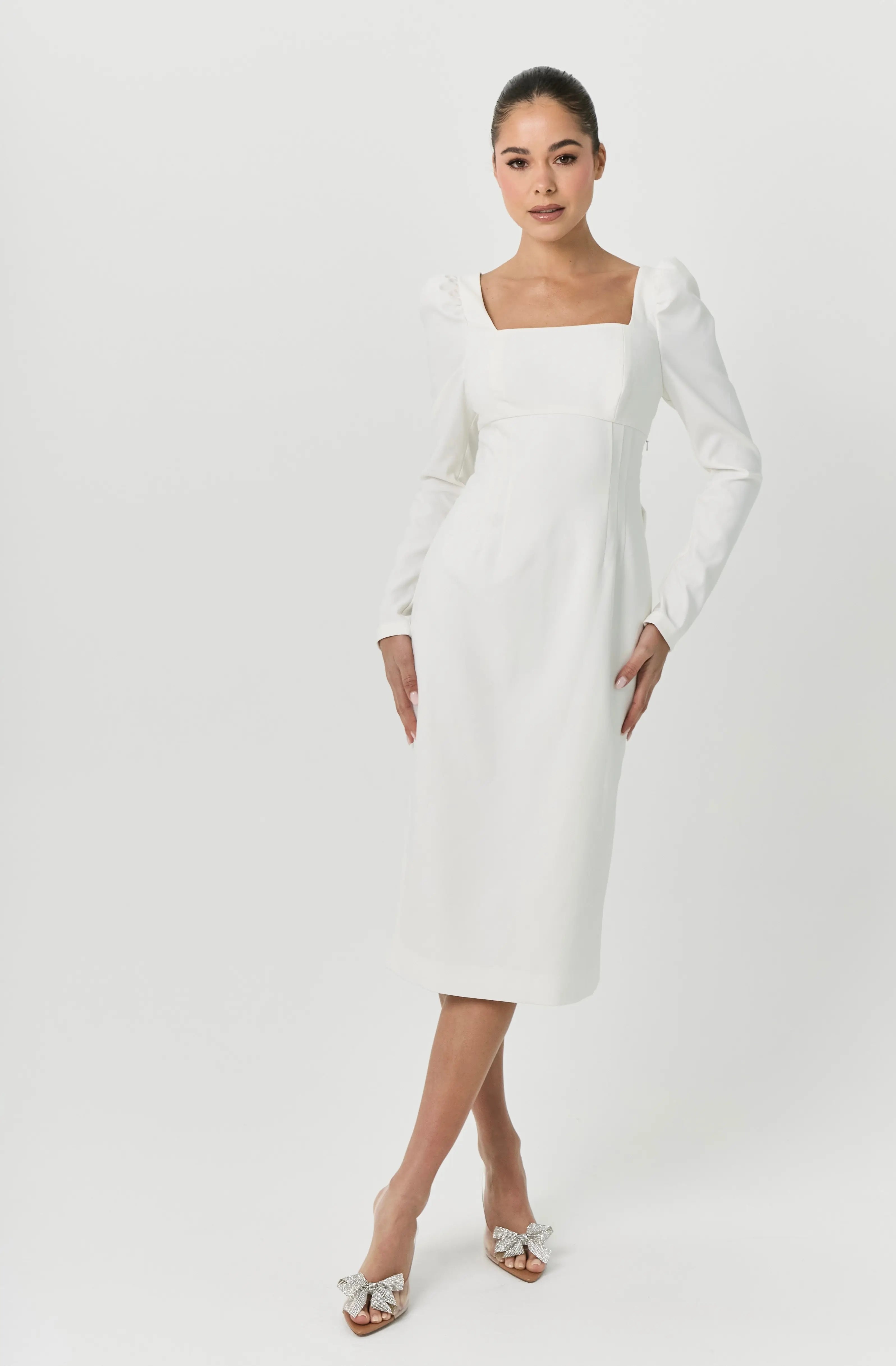 Indulge in elegance with our White Midi Bow Dress. This A-line dress features a long sleeve design and a stunning bow detail at the back. Perfect for bridal celebrations, this dress exudes sophistication and style.