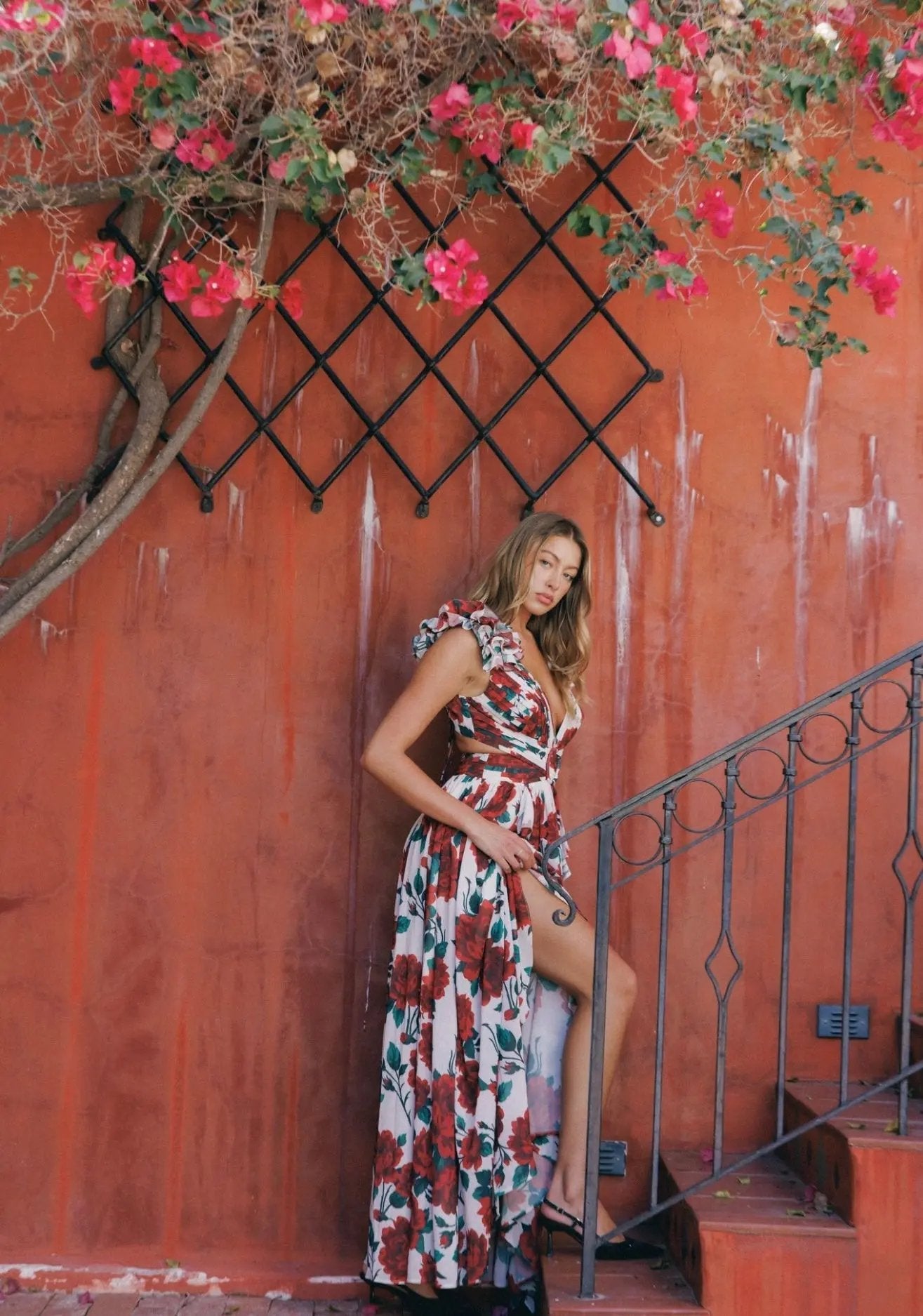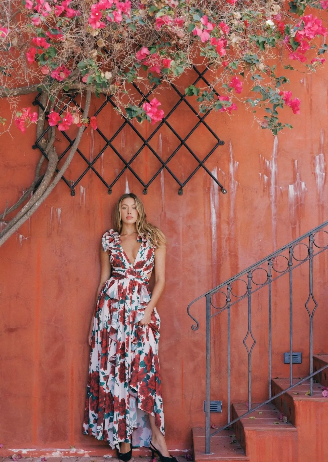 • Floor-sweeping maxi dress made from a lightweight chiffon fabric. Voluminous flutter sleeve made from layers of ruffles. Cutouts at the side that are strategically placed at the smallest part of your waist to flatter your figure. Fabric-covered buckle at the centre in shape of a circle. Laceup tie back closure. Lined half way for a sheer effect at the bottom