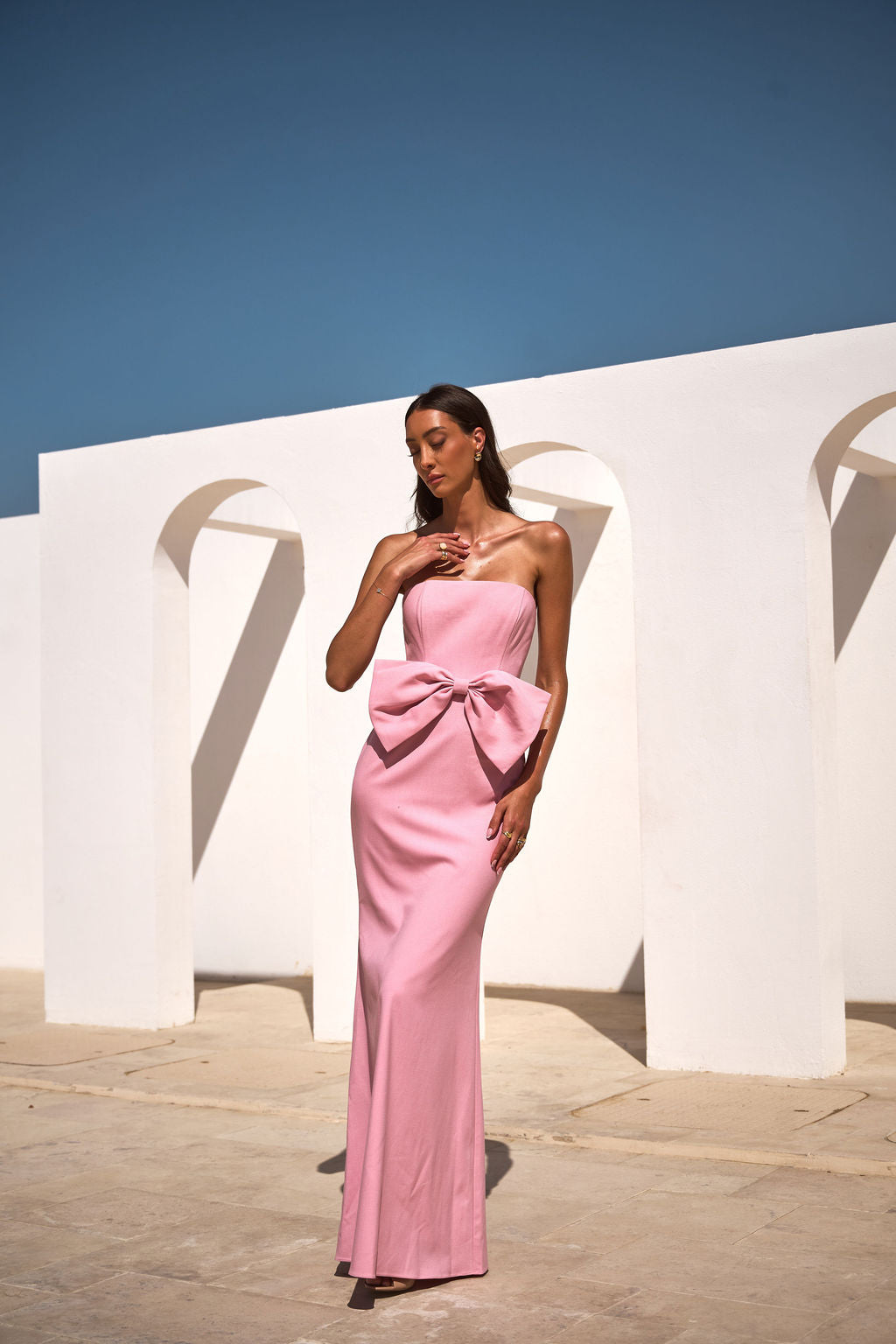 • The Belle Bow Dress commands attention at every celebration. Our signature bow takes centre stage on this maxi silhouette, crafted for bridesmaids and guests who refuse to blend in. Lined throughout for comfort and confidence, it fastens with a discreet invisible zip at the back. Stick-on tape keeps everything precisely in place. True to size for an effortless fit that feels as bold as it looks.
